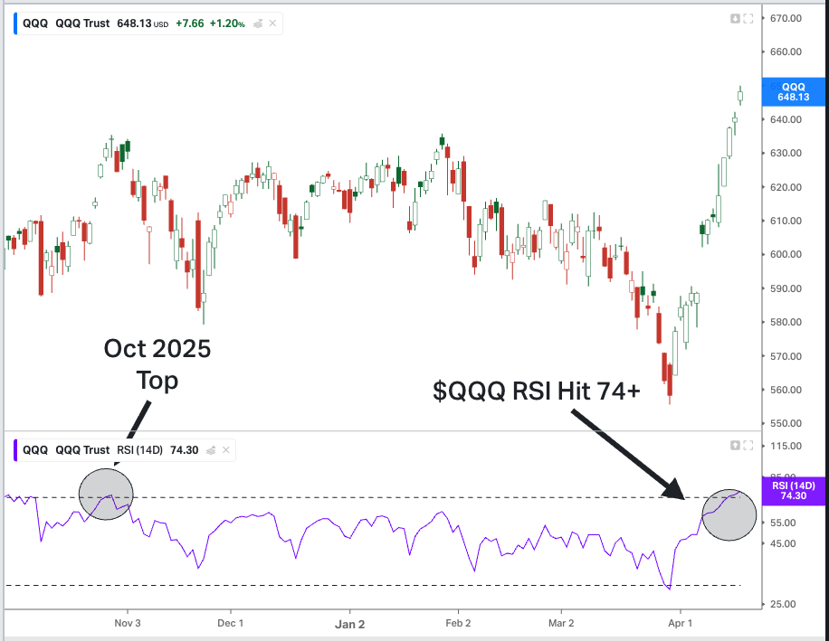 The RSI on QQQ is now 74+, which has marked near-term tops in the past, like last October:
