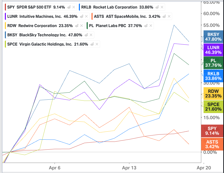 Space-related stocks have been flying this month, led by BlackSky Technology (BKSY) up 47.8% and Intuitive Machines (LUNR) up 46%.
