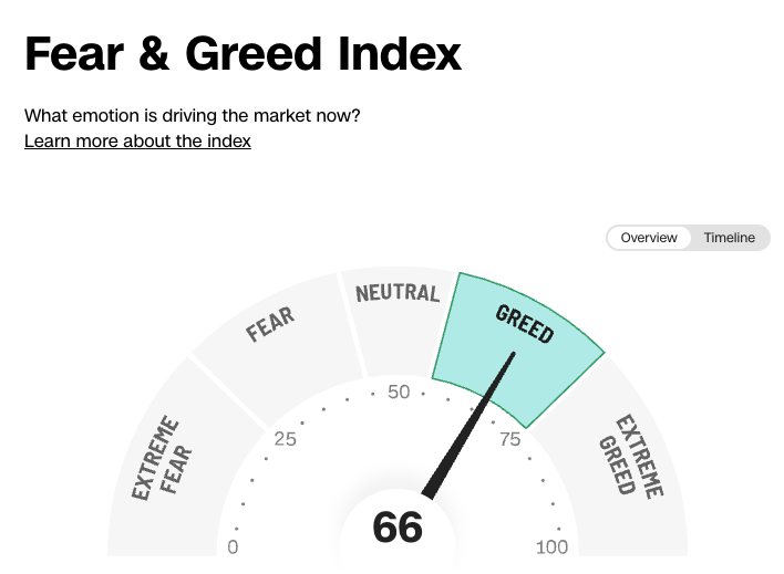 Meanwhile, CNN's Fear & Greed Index is at 66 showing modest greed. This is up from just 18 (extreme fear) one month ago.